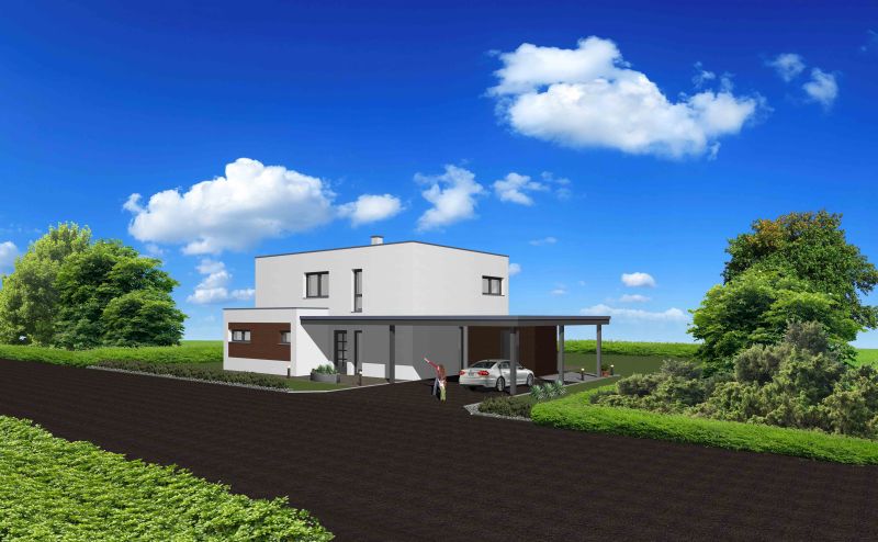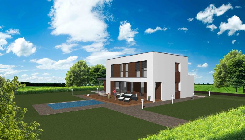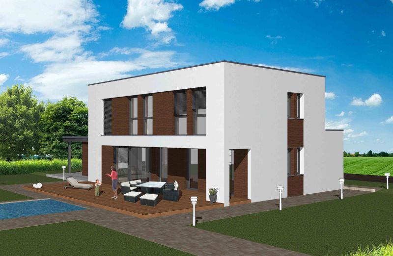 Das PASSION punktet ganz besonders durch seine moderne Architektur: Das Flachdach sowie die Vorsprünge und Rücksprünge können sich sehen lassen – sie sorgen für eine spannende Ästhetik und bringen zusätzliche Platzvorteile mit sich. So bietet dieses raffiniert geplante Fertig-Massivhaus Raum für einen großzügigen, an das Schlafzimmer angegliederten Schrankraum sowie für zwei Kinderzimmer, in denen sich Ihr Nachwuchs voll entfalten kann. Die teilüberdachte Terrasse lässt die Grenzen zwischen Haus und Garten verschwimmen und bringt eine zusätzliche Erweiterung des Wohnraums.